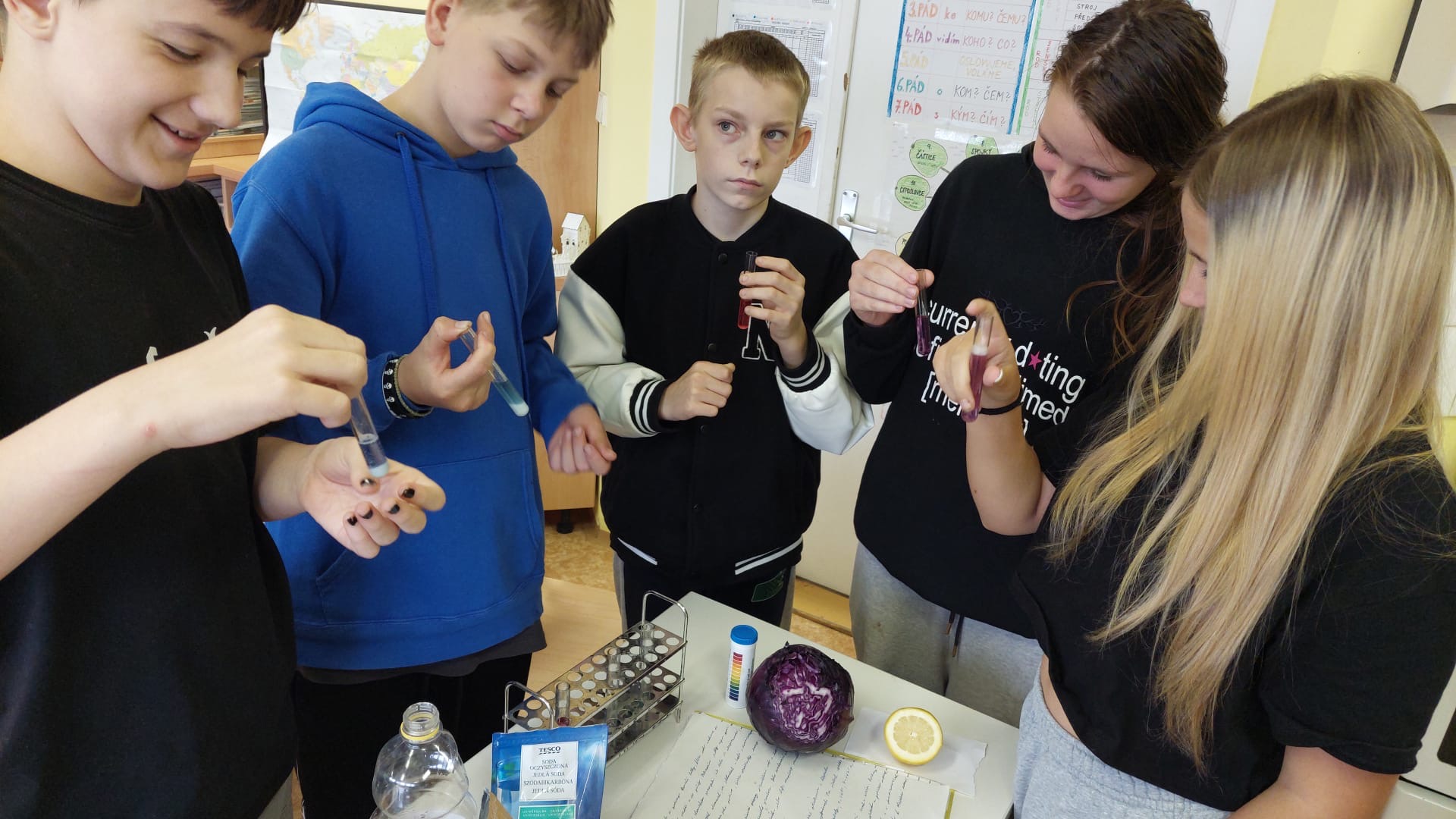 Ani starší žáci nejsou pozadu a hodiny chemie prokládají praktickými pokusy, což je skvělý způsob jak propojit teorii s praxí a probudit v žácích skutečnou zvídavost. Díky dnešnímu pokusu s červeným zelím tak mohli na vlastní oči vidět, jak látky reagují, a lépe si tak zapamatovat nové poznatky.